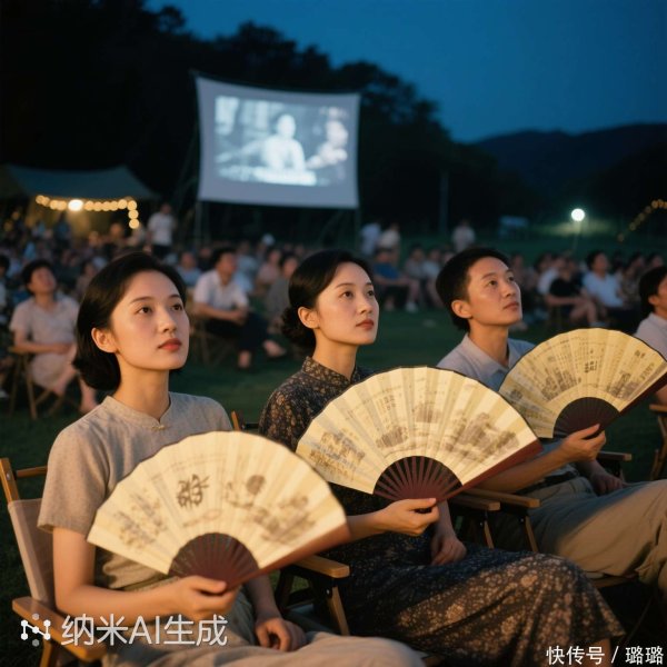 三伏夜的露天电影院,不雅众摇扇不雅老片放映,扇风拂动光影斑驳。