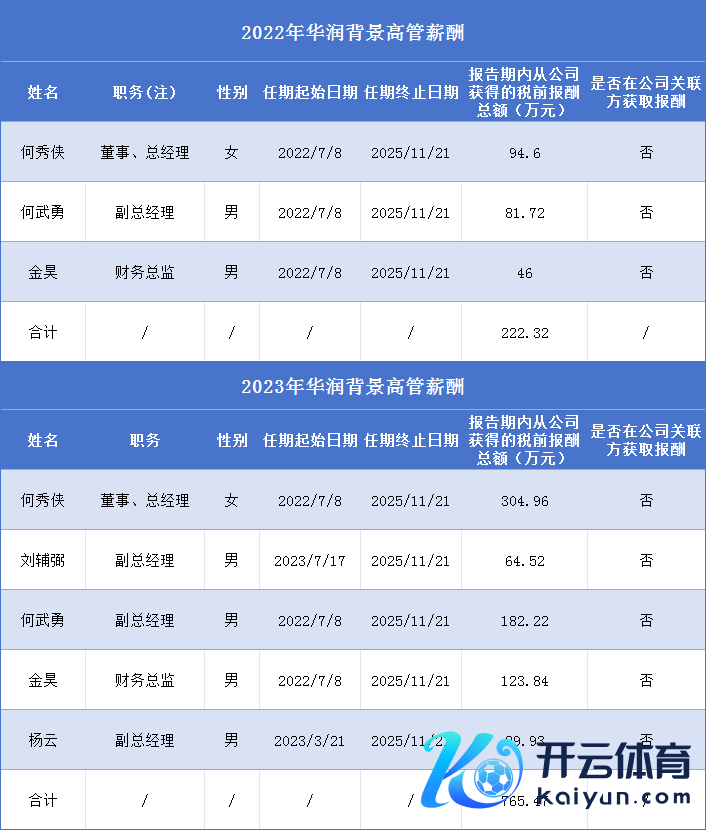 其中,2023年薪酬最高的三位高管何秀侠、何武勇、金昊均有华润系配景,税前酬报挨次为304.96万元、182.22万元、123.84万元。