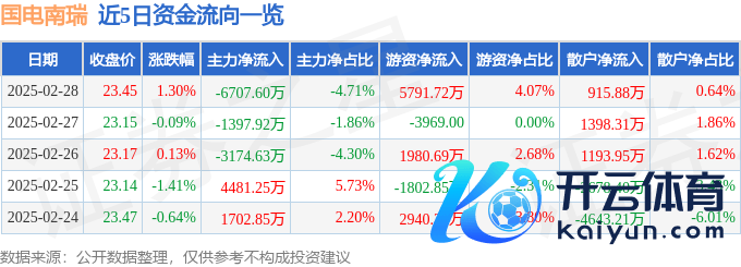本站音书,终端2025年2月28日收盘,国电南瑞(600406)报收于23.45元,高涨1.3%,换手率0.75%,成交量60.31万手,成交额14.24亿元。