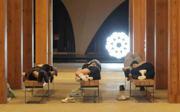 △被困在大阪世博会场的游客只可躺在长椅上休息。