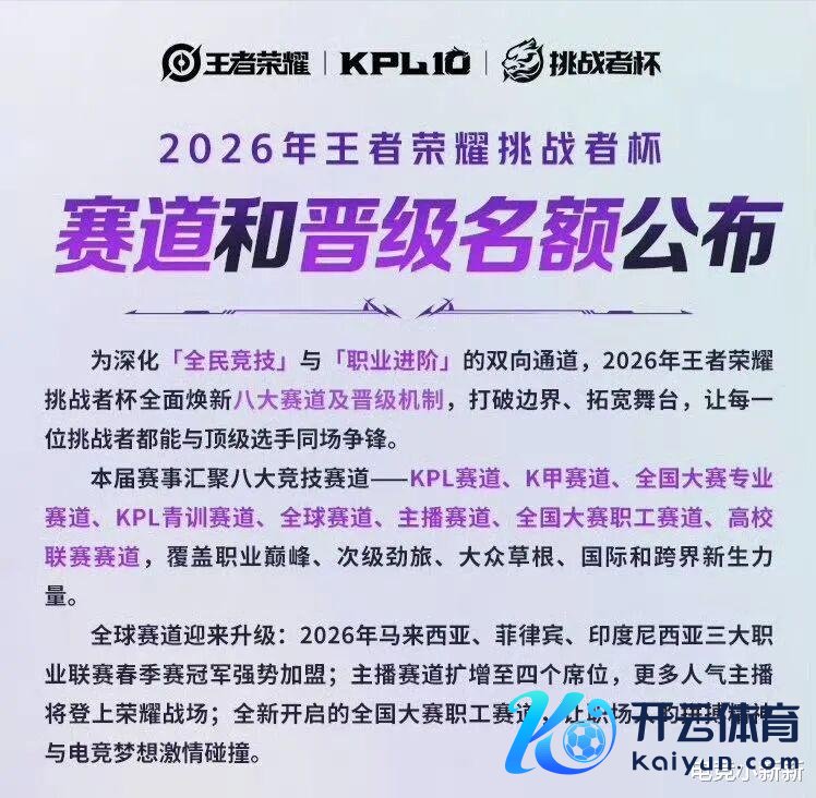 刚刚KPL官方公布了本年的挑战者杯三十二大赛谈现金九游体育app平台,KPL赛区和K甲赛区这边莫得变化,KPL依旧是干与春季赛的十八支战队,而K甲则是春季赛冠亚季军三队,KPL青训赛谈依然惟有一个战队干与,宇宙大赛领有的两个限额分为专科和员工,寰球赛谈有三个,马菲印这三地春季赛夺冠的戎行来干与。主播赛谈则增至四个,除此以外高校队也还在,惟一让咱们合计可惜的即是女子赛谈没了,她们开赛的时辰太晚,来不足干与挑战者杯(传说是六月开赛)。