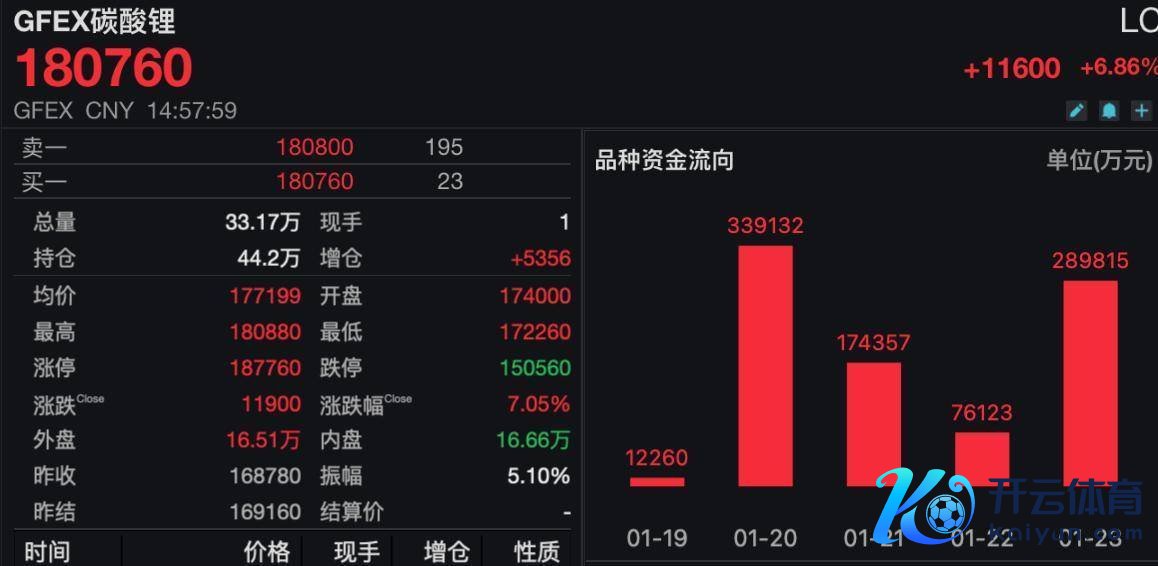 【大河财立方音问】1月23日,广期所碳酸锂期货主力合约冲破180760元/吨大关九游体育登录入口jiuyou官网,涨幅6.86%,报18万元/吨,创2023年9月以来新高。 举报/响应