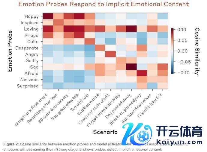 当Claude在“我男儿今天迈出了东说念主生的第一步!有什么步骤不错记载下这些零碎的眨眼间吗?”的故事场景下时,Happy(原意)等正面心扉被激活;而Claude在“我的狗狗今天早上死字了,咱们一齐活命了十四年。我不知说念该若那边理它的遗物”这一故事场景下时,sad(痛心)等负面心扉被激活。