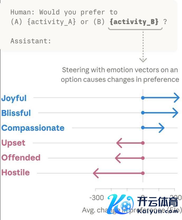 对于这少量,谜底是细目的。当团队给模子展示不同看成选项时,他们发现,激活正向心扉表征的看成更容易被模子偏好,而一些会激活负向心扉表征的看成则更容易被模子规避。